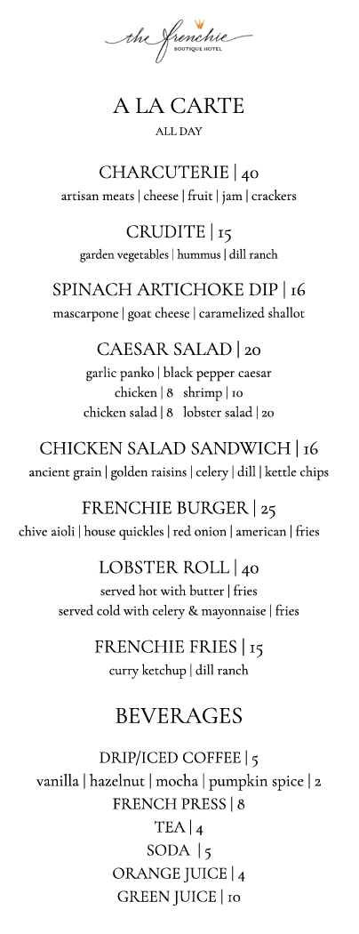 Guests can enjoy on-site dining and drinks 8 am to 10 pm seven days a week. join us in the poolHOUSE for Frenchie’s Signature libations as well as our worldly wine and beer selection.