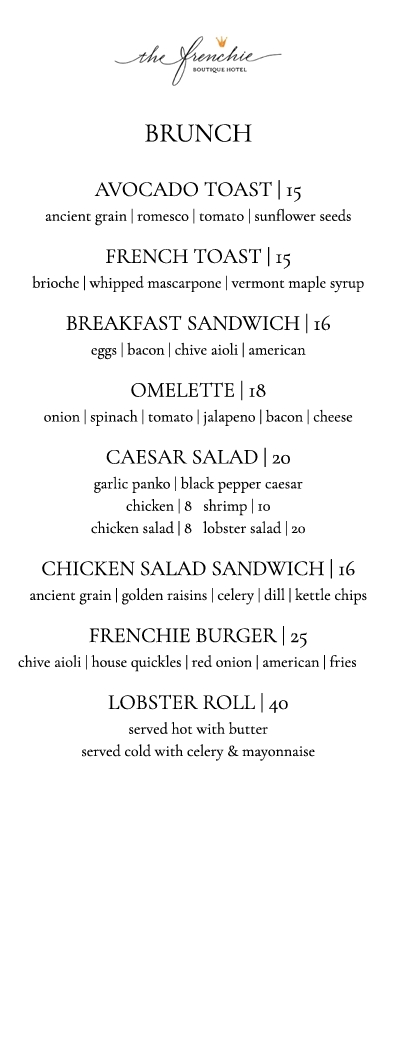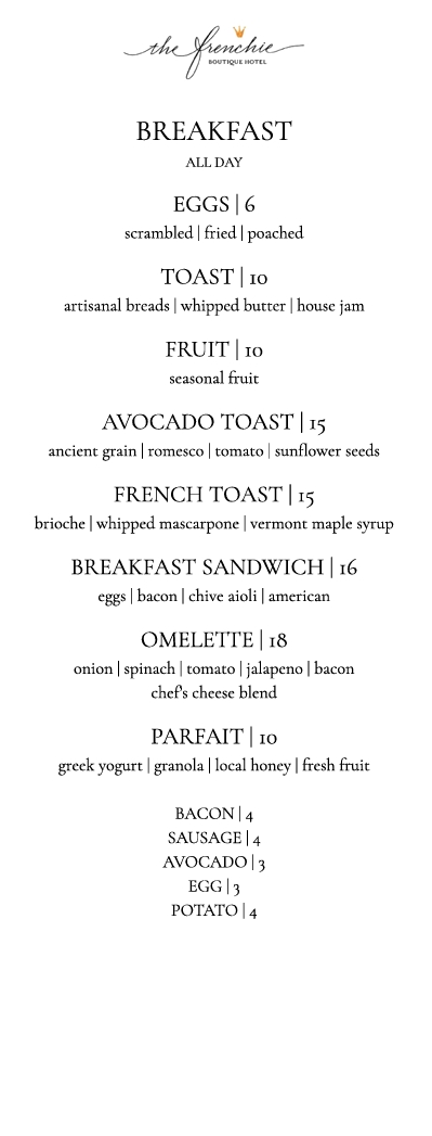 WE BRUNCH EVERY DAY AT THE FRENCHIE! CHOOSE ANYTHING FROM OUR ALL DAY BREAKFAST OR A LA CARTE MENU! NO RESERVATIONS REQUIRED!
